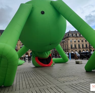 Alors qu’un vent d’homme (usual suce pet de nonne) vient caresser les bijoux de la place Vendôme — à la mémoire de ceux qui se sont fait la malle, entre le monte-charge d’un poids lourd de la finance, la disqueuse d’un DJ proctologue et le scooter d’un président flanby —, une grenouille ballonnée, du haut de ses vingt mètres, s’apprête à poser une pêche sur les pavés de ce premier arrondissement parisien — vil quartier cossu de fil d’or, de sang et d’argent sale !